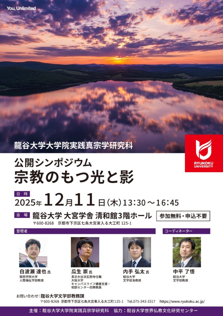 2025年12月11日(木)、13:30~16:45、本学大宮学舎清和館3階ホールにおきまして、当センター協力事業の公開シンポジウム「宗教のもつ光と影」が開催されます。ご興味ございます方は是非ご参加ください。