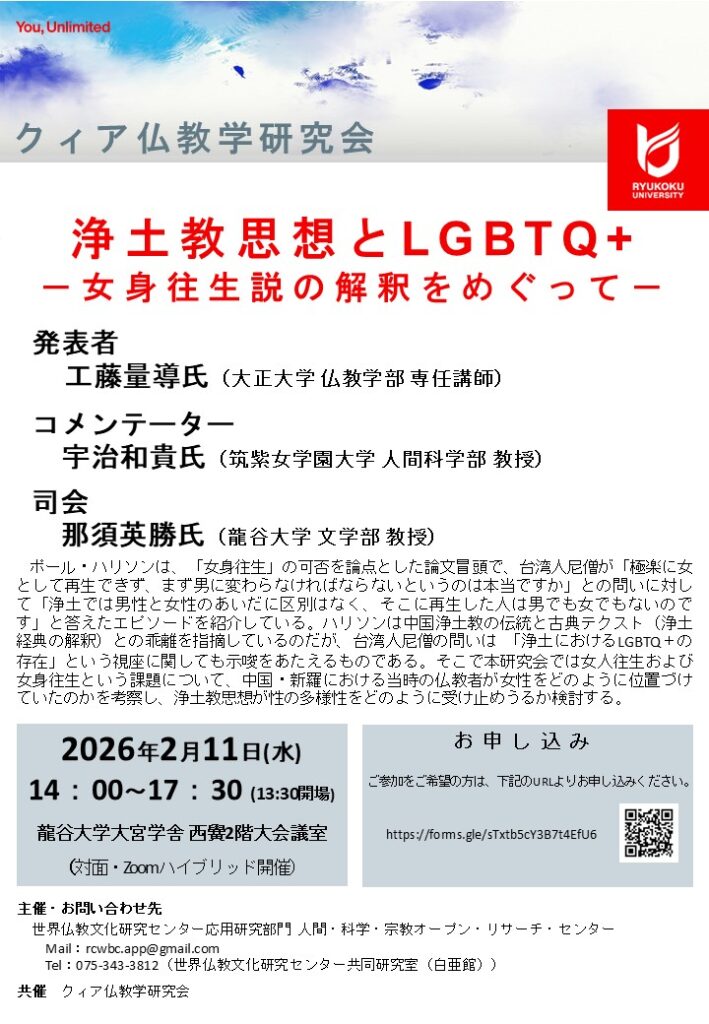 この度、2026年2月11日(水)14:00より、本学大宮学舎西黌2階大会議室におきまして、工藤量導氏(大正大学仏教学部専任講師)をお招きし、クィア仏教学研究会「浄土教思想とLGBTQ+ -女身往生説の解釈をめぐって-」を開催いたします。